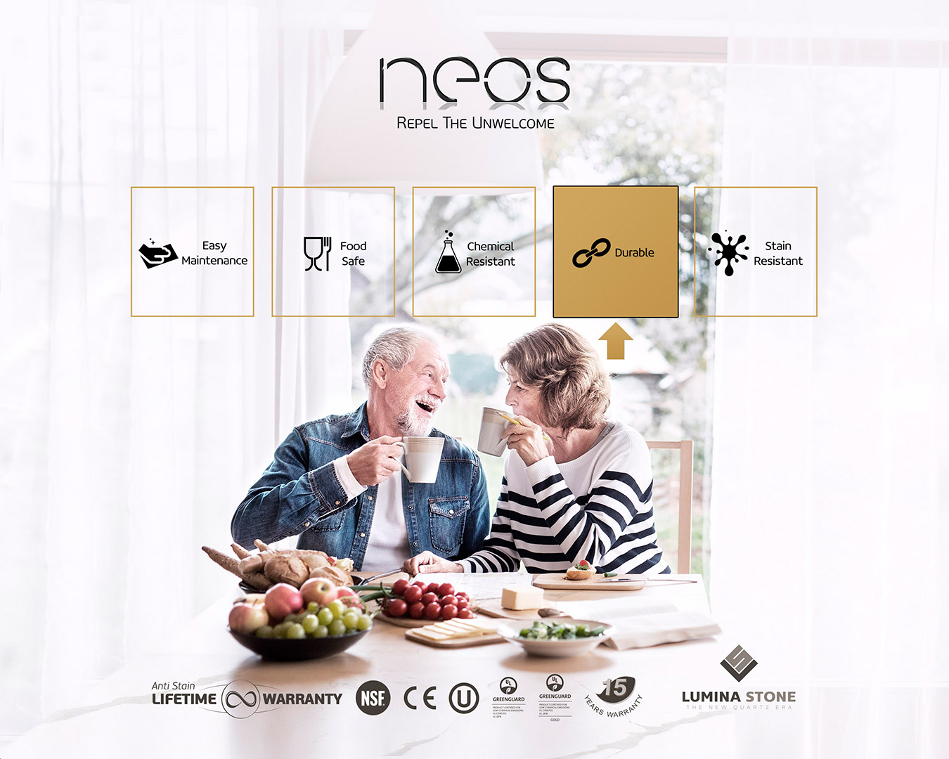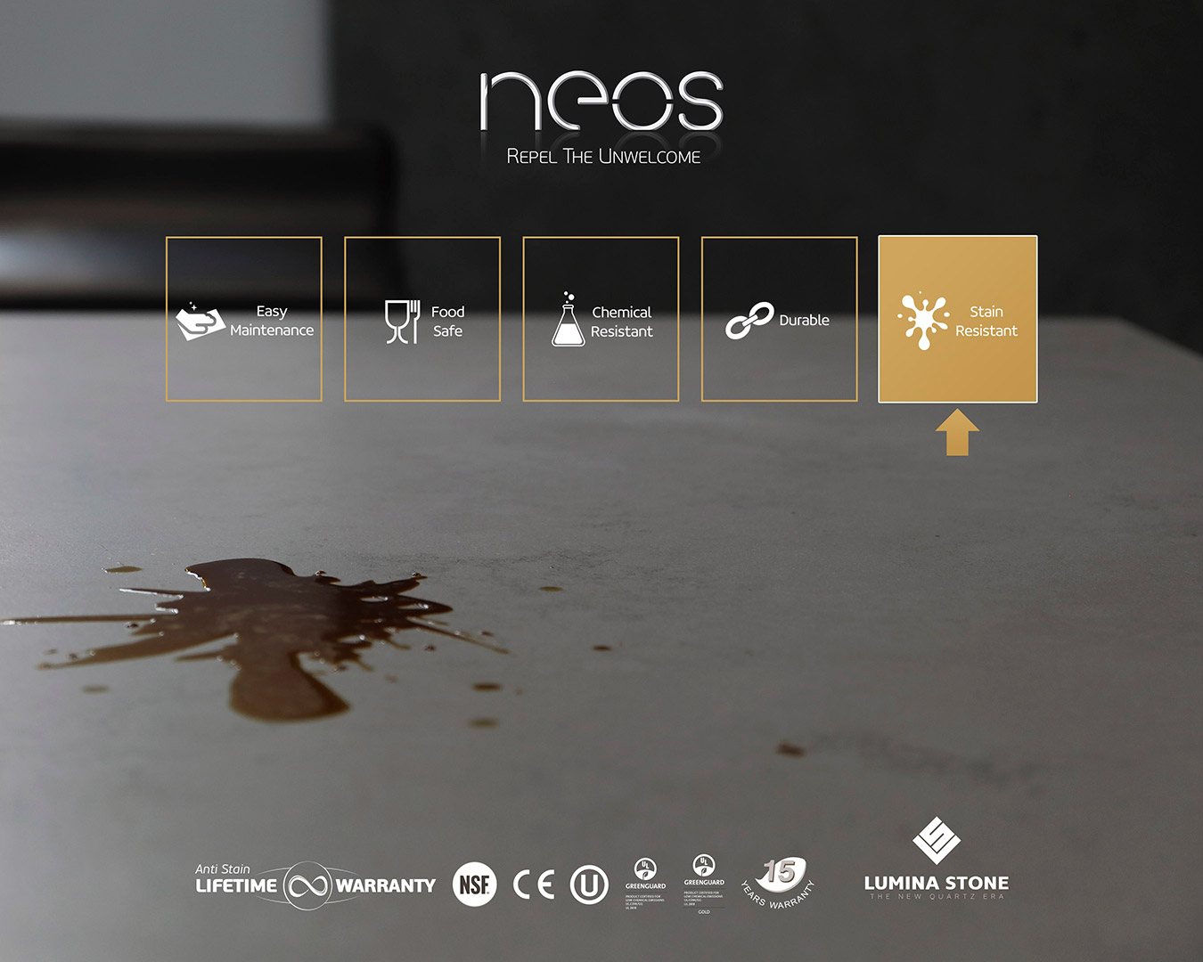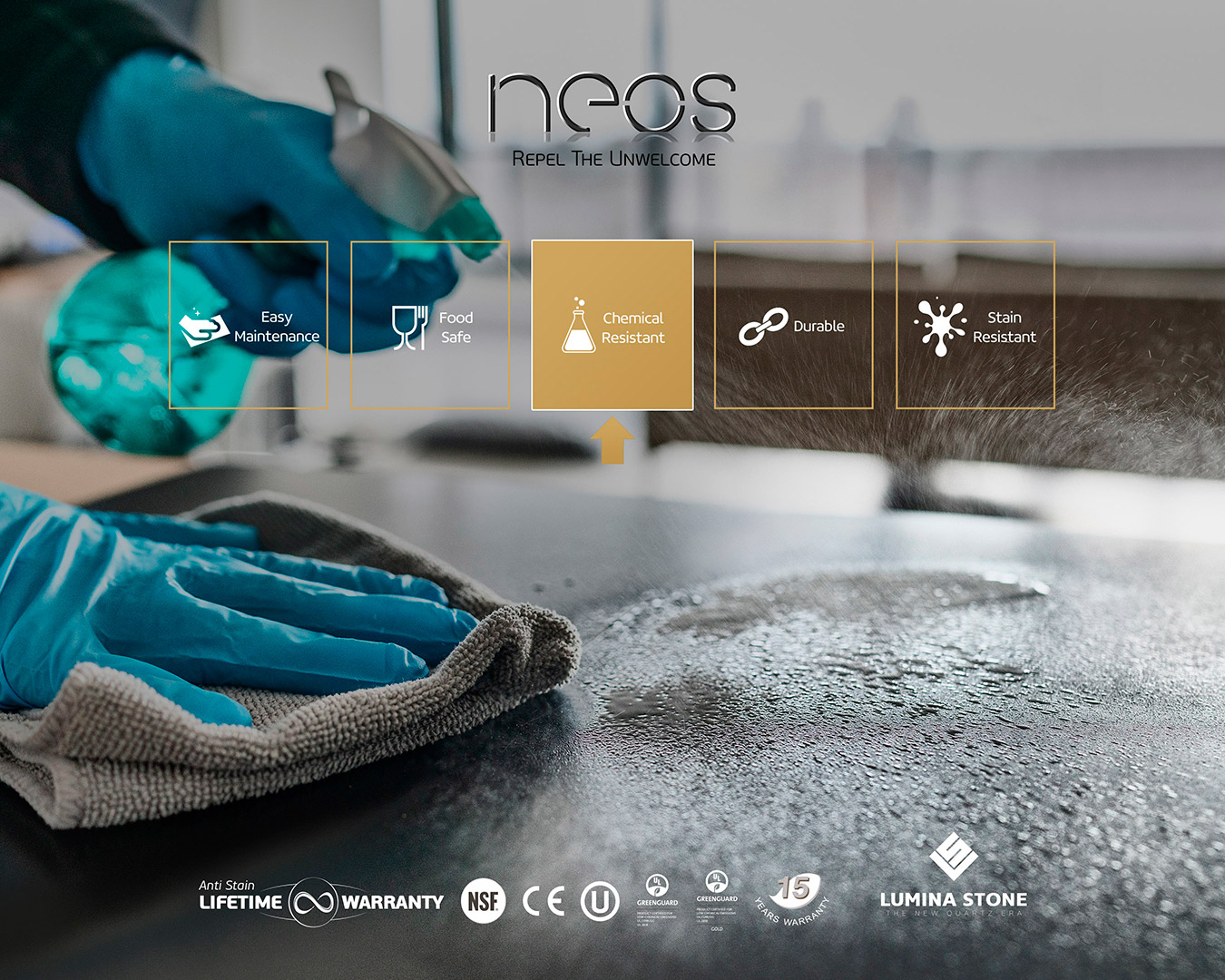 Nano Enhancement of Surfaces (NEOS), is a new high-performance stain and substance repellent technology developed for Lumina Stone surfaces. Invisible to the naked eye, NEOS has been scientifically formulated to produce a hybrid protectant with physical characteristics that resists staining, keeps surfaces clean and guards against everyday wear and tear. With the application of NEOS, Lumina Stone is safety protected most common household chemicals.